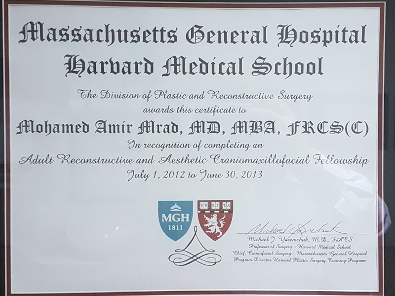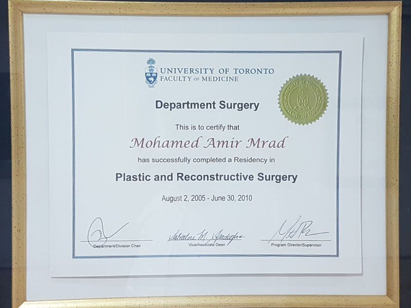 After completing his training in Toronto through rotating in the well known Toronto hospitals, Dr. Mrad passed the Royal College exam and became board Certified in Canada to practice plastic surgery.